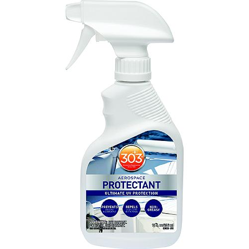 Originally engineered for aerospace and aviation applications, 303 Aerospace Protectant is a premium surface treatment that instantly beautifies and provides superior protection against harmful UV rays that can cause discoloration, fading, embrittlement, cracking and/or chalking of surfaces. 303 Aerospace Protectant also repels dust, dirt, lint, soiling, staining, water spots, salt water and mildew. Safe and effective for vinyl, clear vinyl, gel-coat, fiberglass, carbon fiber, synthetic/natural rubber, plastics and finished leather. Powerful UV blockers prevent fading and cracking of vinyl, rubber and plastic surfacesDries to a clear matte finish - no oily or greasy feelRestores lost color and lusterEasy to use: Simply spray on and wipe drySafe and effective for: vinyl, Plexiglas, carbon fiber, rubber, plastics and finished leatherMade in the U.S.A.