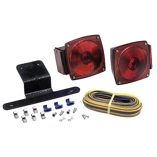 Includes: 2 stud-mount tail lights with red side marker/reflectors, license bracket, 20' wiring harness and hardware. Meets the requirements of SAE/DOT/FMVSS/CMVSS standards when properly installeScrew-on lens, easy to change bulbsStud mount on 2" centersGrounds through mounting studsShock-proof socket guarantees long bulb lifeAcrylic lens, corrosion proof plastic housingPassenger side light is 6-function: stop, turn, tail, rear reflex, side marker, and side reflex