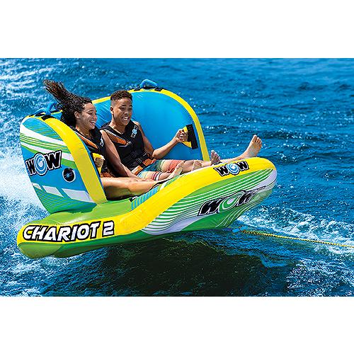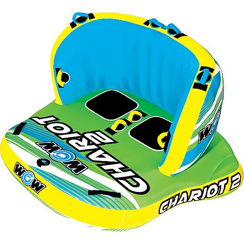 Chariot comes with all the safety, durability, and speed features you'd expect in a two person towable. Sit, stand, or kneel close to a friend as the two of you zip over blue waves. In addition to having three ways to ride, there are dual tow points that allow the tube to face either direction. The backrest on Chariot, plus the foam webbing handles, provides support so you can stay on the float when you're speeding ahead and catching serious wind. Vibrant green and blue colors. Towable lake float is made from heavy duty materials.