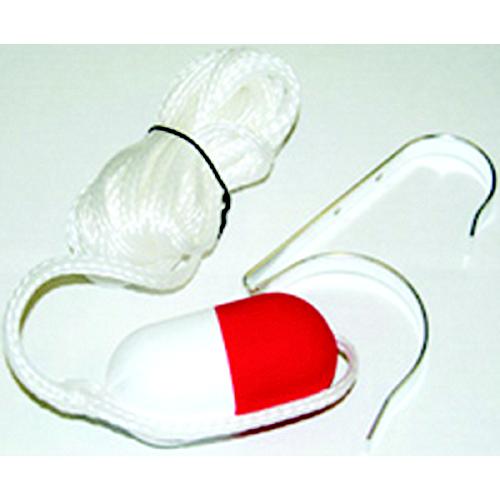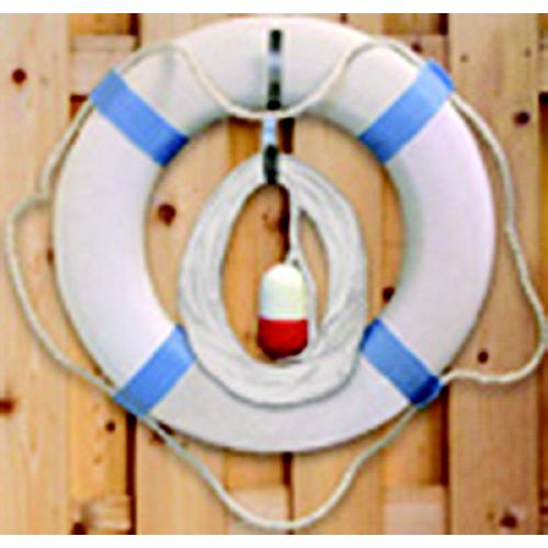Ring holder is constructed from anodized aluminum. Fits all sizes of ring buoys. Comes complete with 30' or 60' mildew resistant, white U.V. polypropylene floating heaving line with attached rope float.