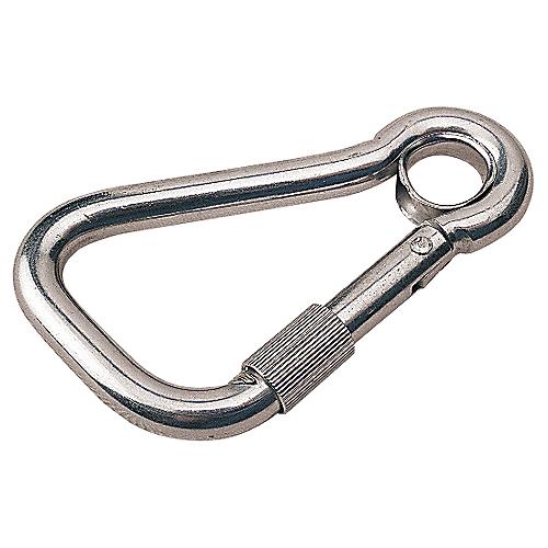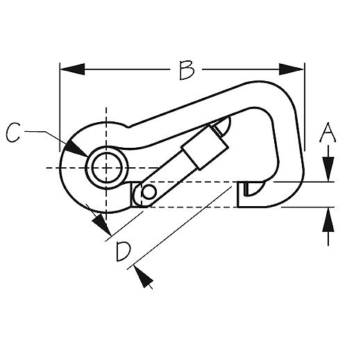 Designed to place more of the load on the stronger, non-gate side which significantly increases the breaking strength over traditional rounded style snap hooks. The offset body style allows greater gate clearance, increasing the passage area into the snap. The eye insert provides a secure attachment to lines for use on harnesses, fishing lines, mooring buoy lines, etc. The barrel locking gate locks automatically when released, greatly reducing the possibility of accidental opening. Locking cylinder also reduces wear on the rope and allows for one-handed operation. Formed 316 stainless steel.