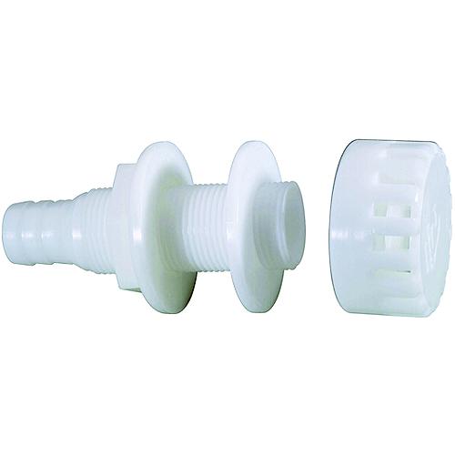Thru-hull connector with strainer prevents clogging of the aerator pump. Strainer attaches to threads that extend beyond external retaining nut. Acetal construction.Note: Do not use strainer as a thru-hull connector nut replacement. Thru-Hull connectors are designed for installation above the water line only.