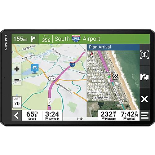 With the RV Navigator, you'll travel with a large display, custom routing for the size and weight of your rig plus vivid aerial views to help you with a smooth arrival at your RV park or campground. Enjoy the view. The large touchscreen shows your route and includes detailed map updates of North AmericaTravel confidently along a custom route that's based on the size and weight of your rig (Not available in all areas)Know what's ahead with road warnings for steep grades, sharp curves and moreArrival at your campsite has never been easier, thanks to BirdsEye Direct Satellite ImageryDiscover the best spots along your route, and learn of recommended activities near your destinationPlan your stops with a preloaded directory of campgrounds, RV parks and services plus Tripadvisor® traveler ratingsGarmin Voice Assist Responds to your spoken requestsWireless updatesLive traffic, weather and fuel pricesHands-Free callingDirectory of RV parks, services, amenities and more
