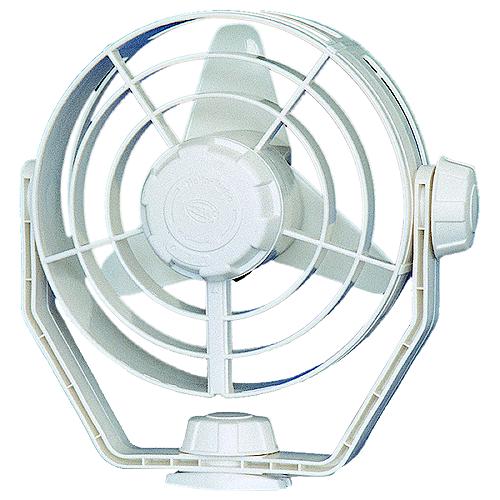 Can be turned and pivoted in all directions, and locked in position. For air circulation in cabin or defogging bridge windows in bad weather. Low-noise operation. Black, impact-resistant plastic housing. Soft plastic impeller with guard. 12 volt.