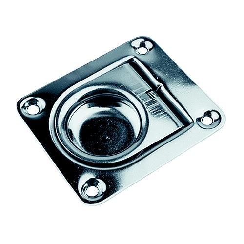 Constructed of corrosion resistant 304 stamped stainless steel. These ring pulls are ideal for use on doors, hatches, lazarettes, and dock boxes. Spring loaded handle prevents rattling and stays flush against the base, even in vertical applications. Installs with four FH fasteners (not included).
